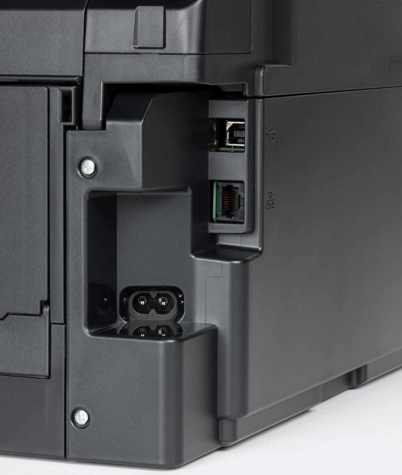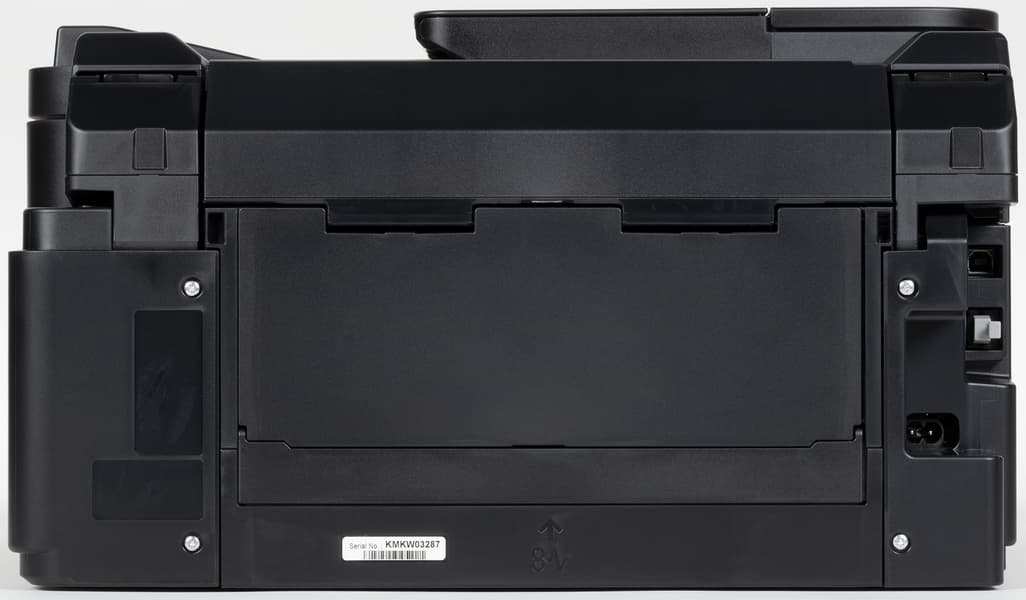Все три разъема — для кабелей питания, интерфейсные USB и Ethernet — расположены сзади, причем в небольшой нише, а потому вставляемые в них коннекторы практически не выходят за габариты принтера. Тем не менее, откинутая крышка заднего подающего лотка потребует оставить позади аппарата не менее 12-14 см свободного места.