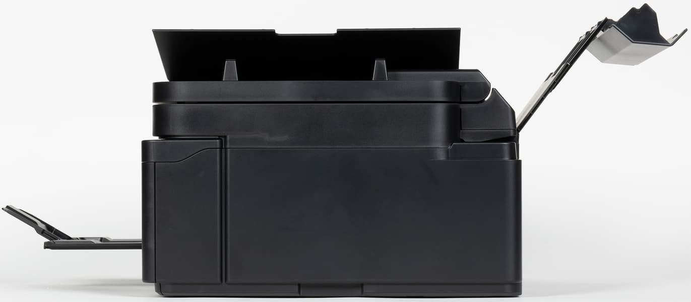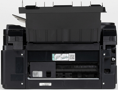 Верхняя часть МФУ откидывается вверх на угол около 35° с фиксацией в открытом состоянии, предоставляя доступ к узлам и механизмам принтера, а также к расположенному слева встроенному чернильному контейнеру.