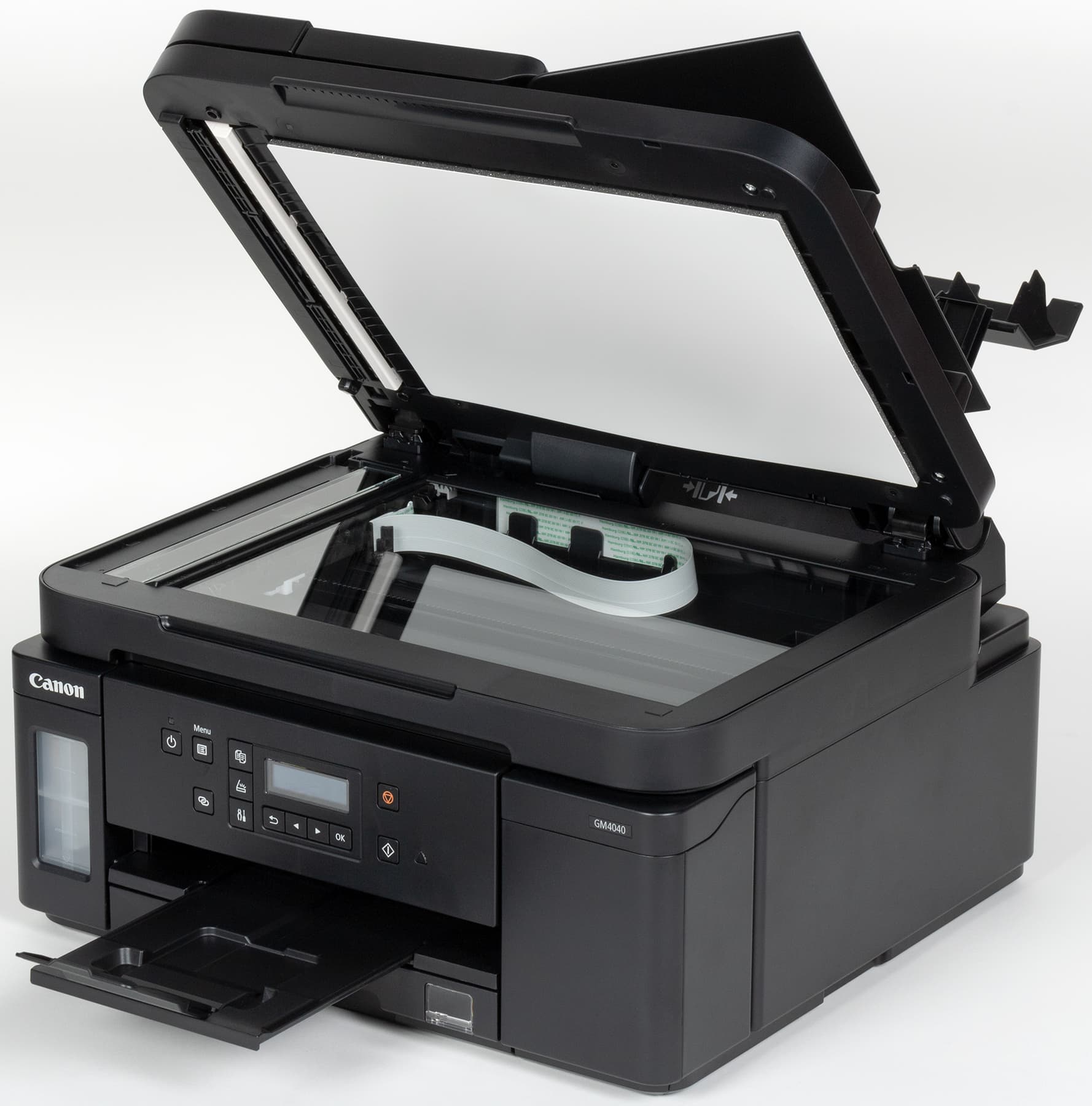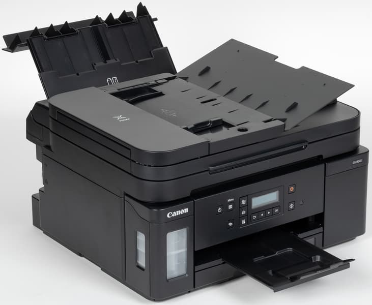 Сканер расположен стандартно для подобных МФУ — продольно в верхней части. В отличие от уже упоминавшейся модели Pixma G6040, имеется автоподатчик, вместимость лотка которого в спецификации обозначена как 35 листов с плотностью 75 г/м², то есть стандартной офисной бумаги 80 г/м² поместится немного меньше. В лотке имеется откидная крышка и боковые направляющие для выравнивания стопки оригиналов.