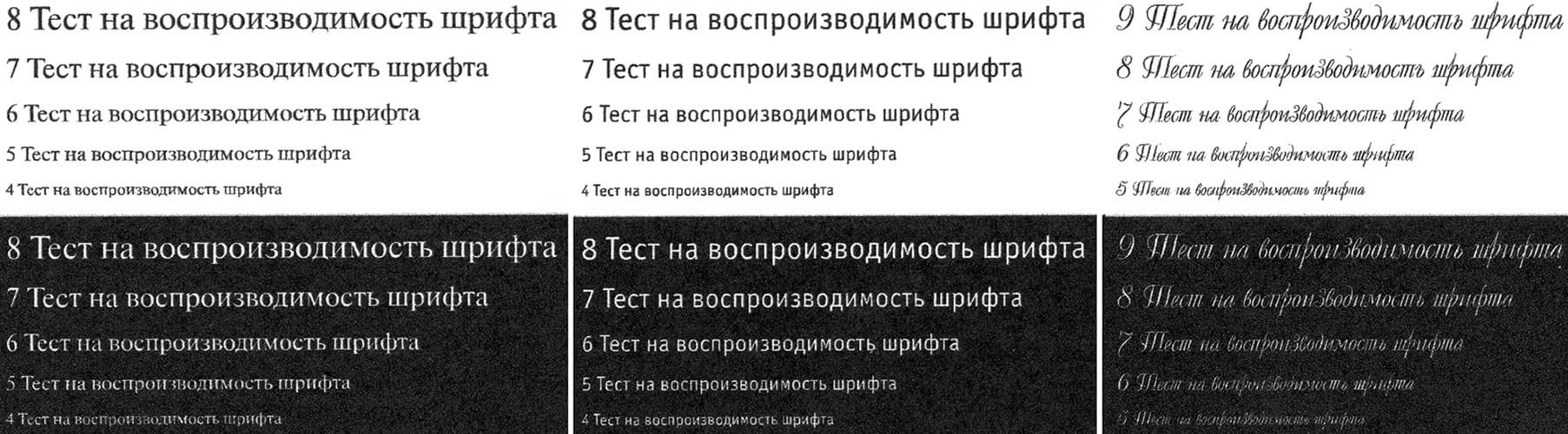 Текстовые поля воспроизводятся неплохо: при нормальной печати шрифты с засечками и без читаются от 4-го кегля, вывороткой — без засечек от 5-го, с засечками от 6-го кегля. Декоративный шрифт реально читается с кеглем от 6-го нормальный, а вывороткой даже 8-й кегль читается с трудом.