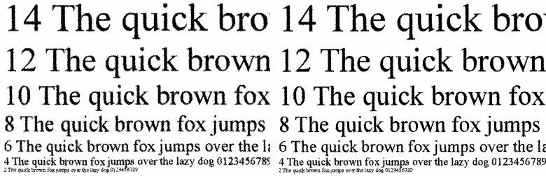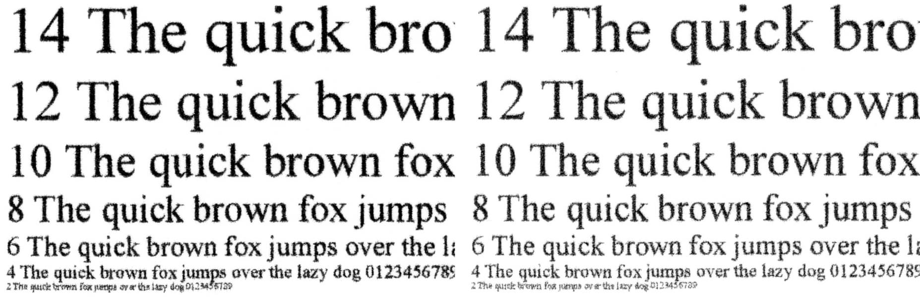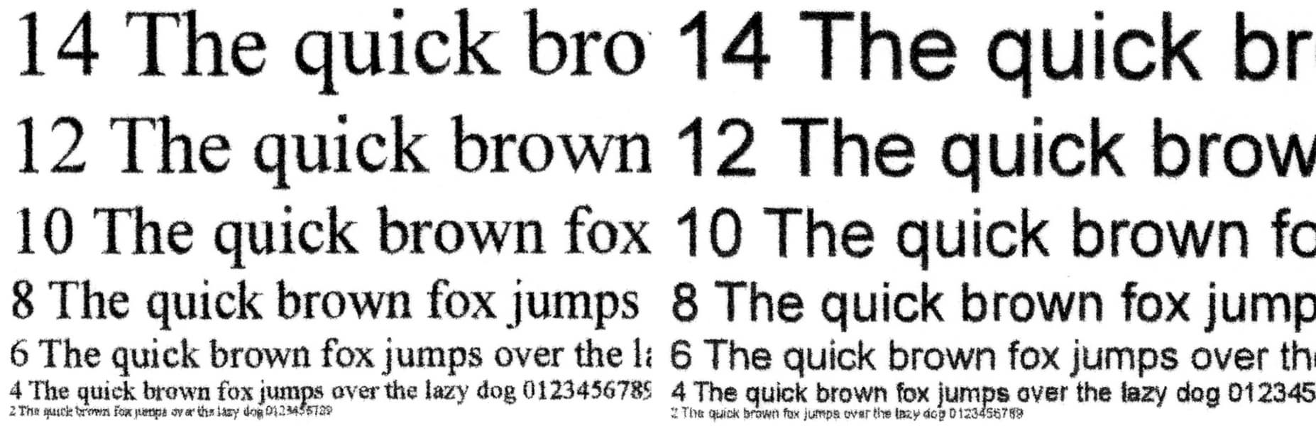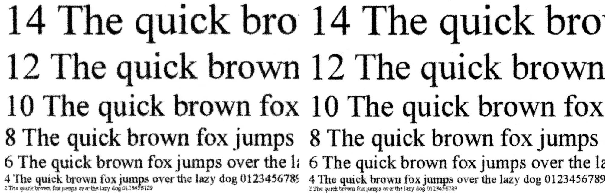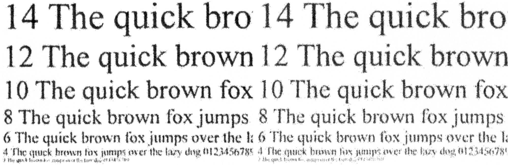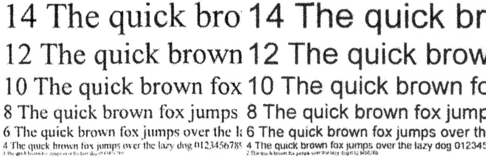 Сделанные со стандартным качеством с отпечатка, на котором отчетливо читаются шрифты 2-го кегля, копии получаются неплохо: 4-й кегль без засечек читается (хотя и с некоторым трудом), с засечками буквы такого размера скорее угадываются, заливки достаточно плотные, контуры букв ровные, хотя при увеличении можно заметить некоторые дефекты.