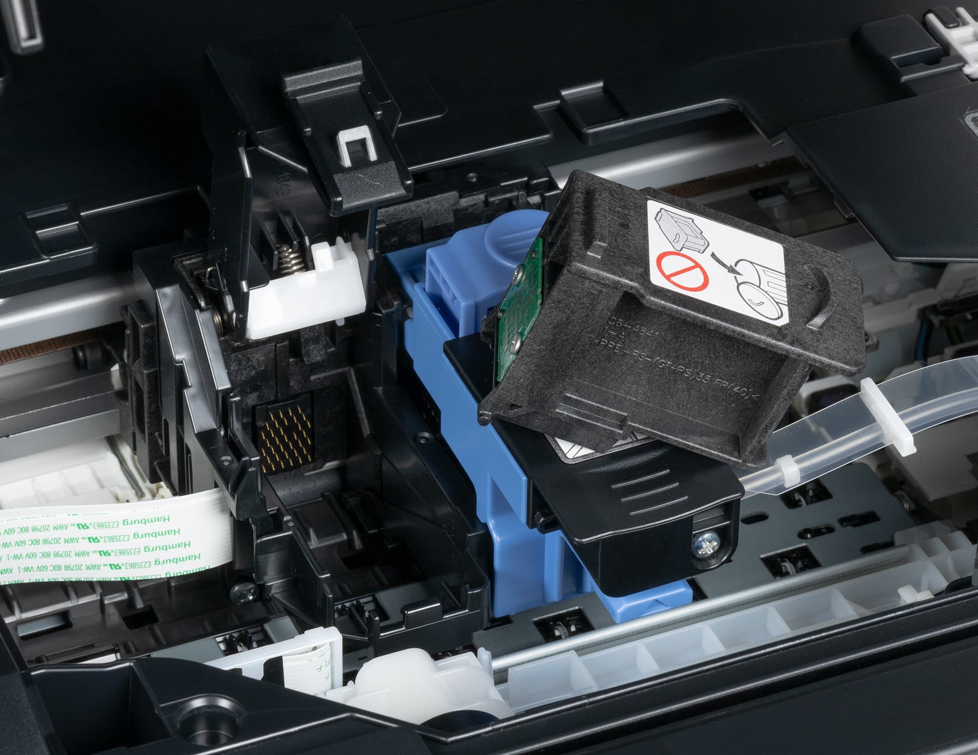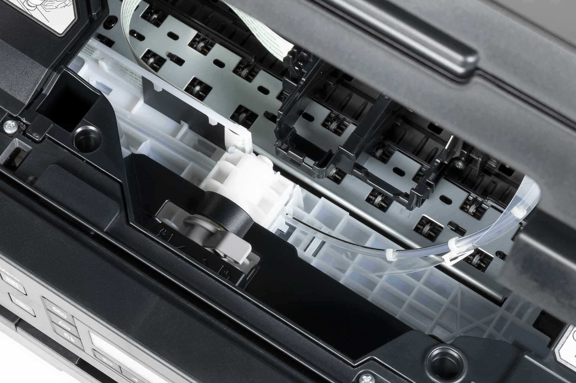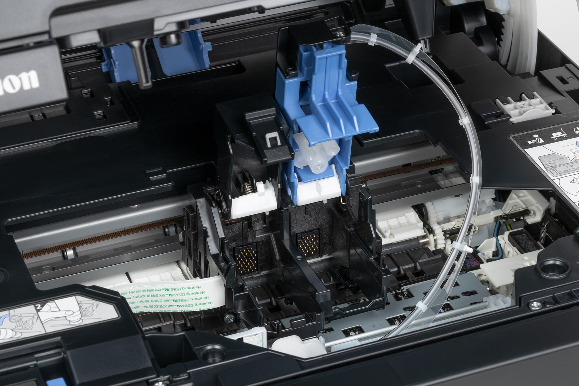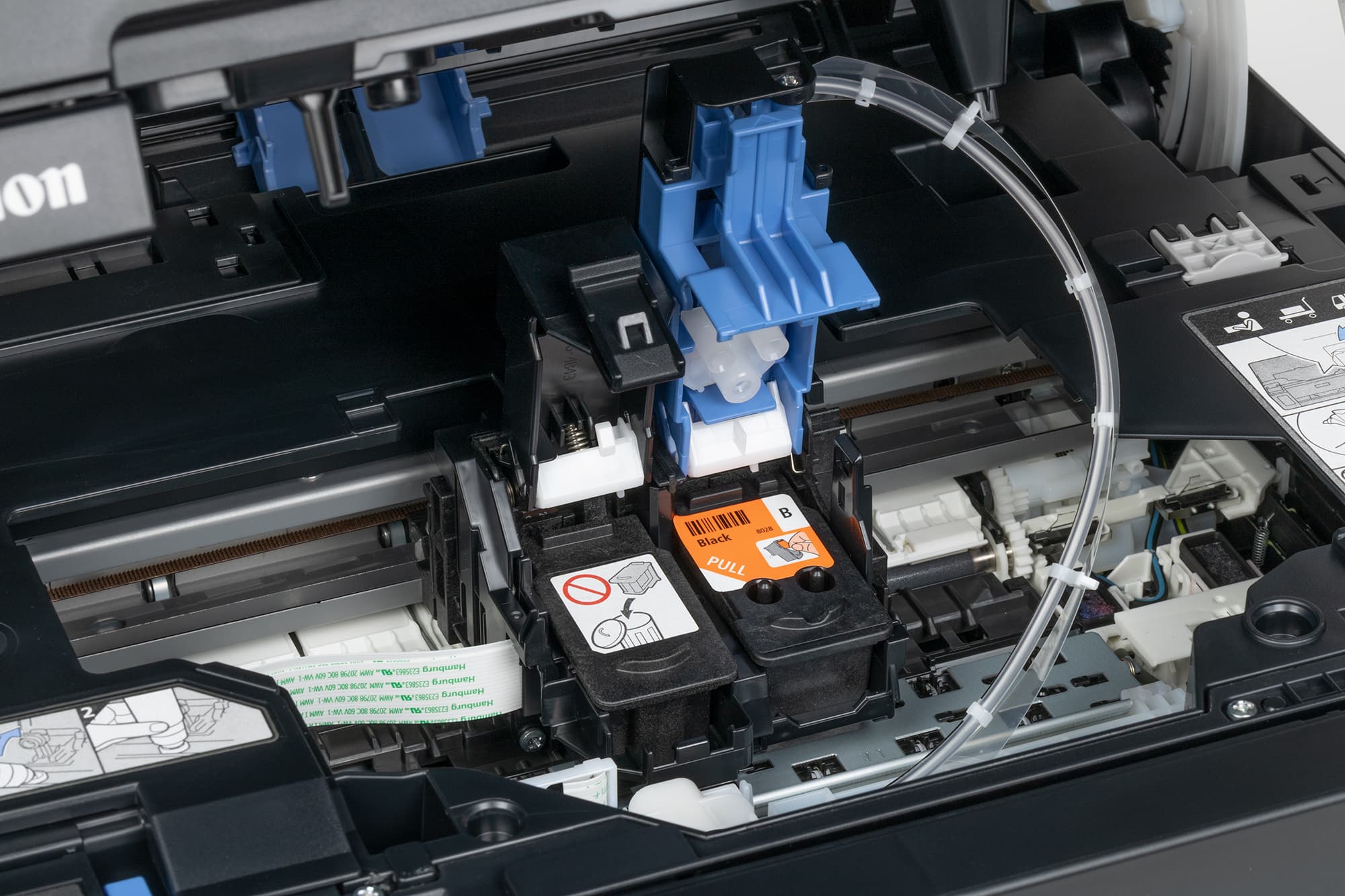 Немного глубже находится каретка с держателем печатающей головки, чернила к которой подаются через аккуратно проложенную трубочку. Рядом закреплен аналогичный держатель для цветного картриджа (естественно, уже без трубочек), в отсутствие которого там находится заглушка.