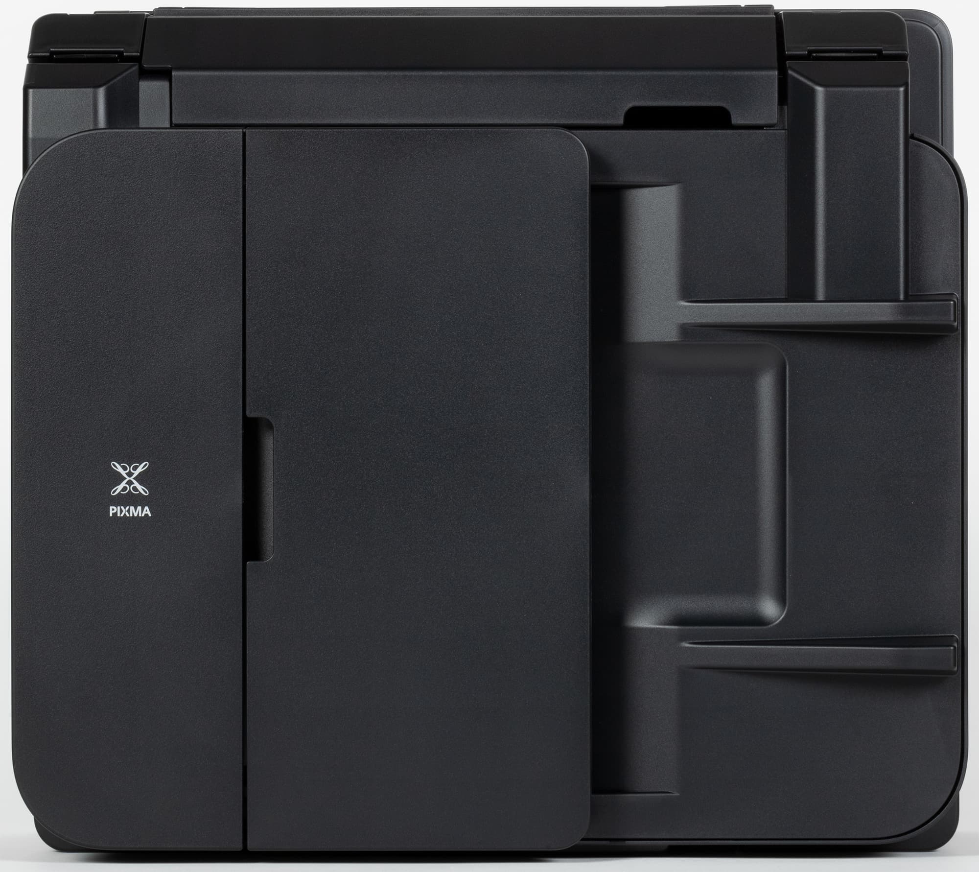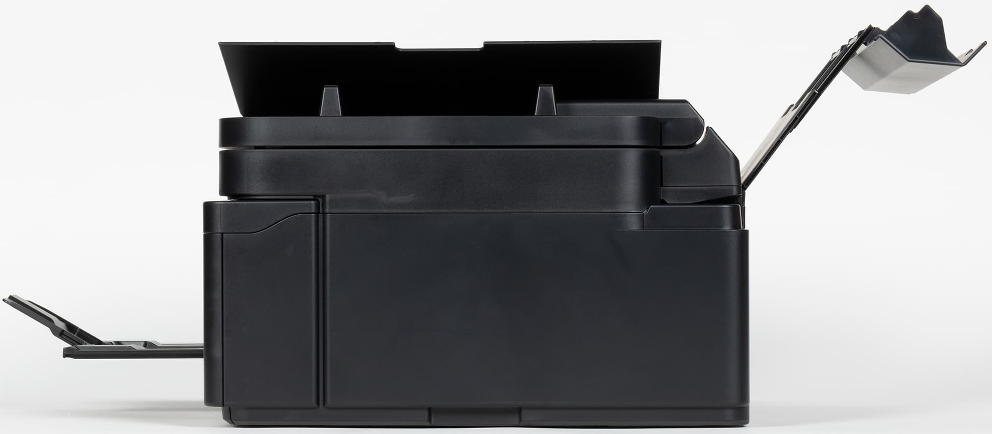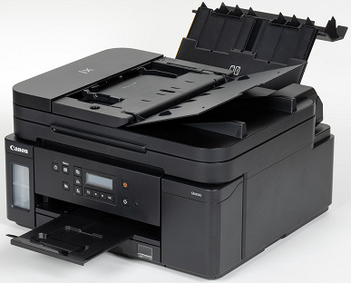 В рабочем положении лотка его откинутая наружная крышка выглядит несколько чужеродно, к тому же заметно увеличивает глубину МФУ, но то же самое наблюдается и в уже знакомом нам аппарате Pixma G6040.
