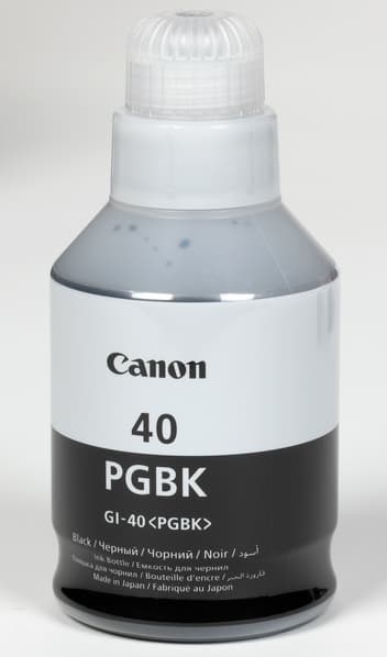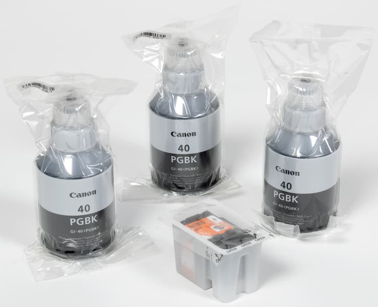 Черные чернила (пигментные) те же, что в уже знакомом нам аппарате Pixma G6040, в таком же контейнере-бутылочке GI-40 на 170 мл и с той же наработкой в 6000 отпечатков.