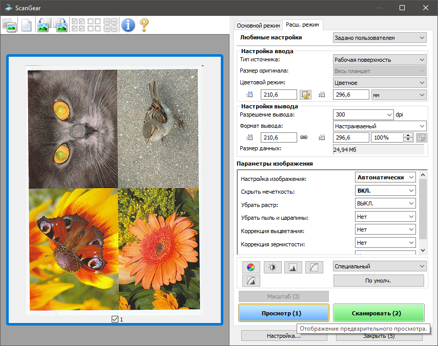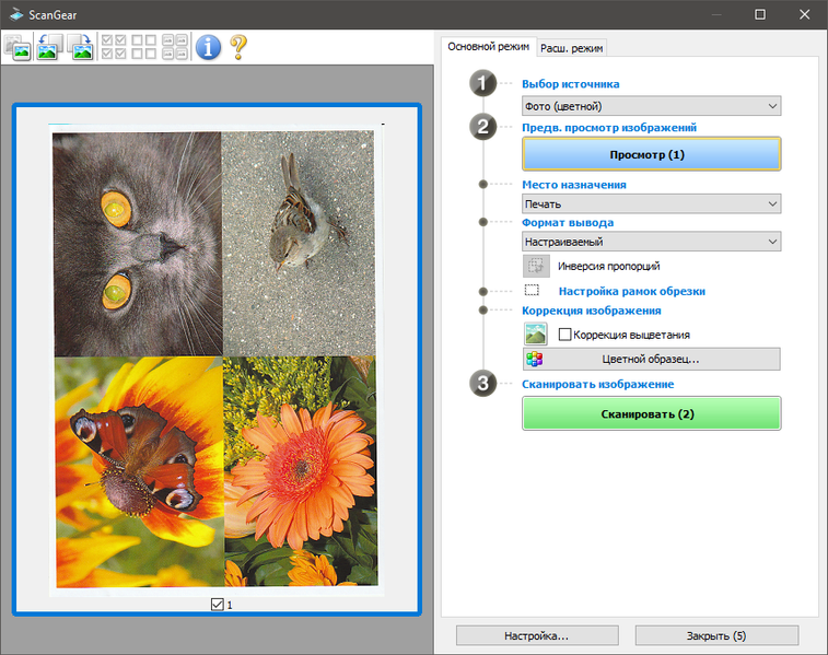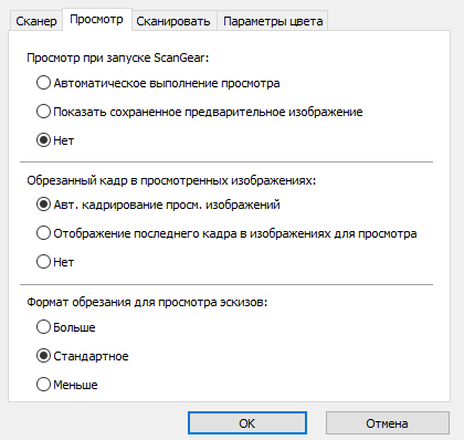Отключить просмотр эскизов можно в окне, появляющемся по нажатию кнопки «Настройка...» в ScanGear.