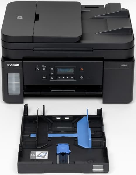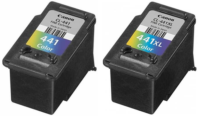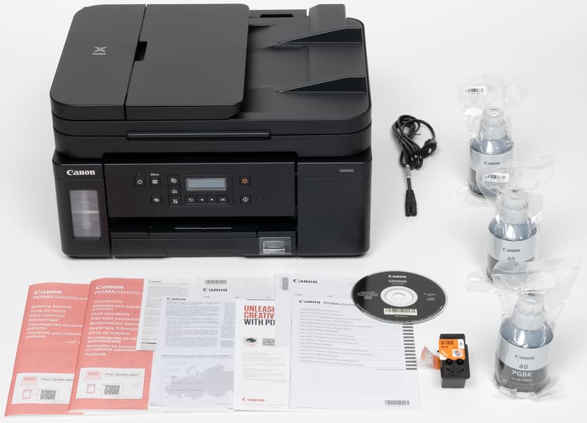 Предлагаются две разновидности: CL-441, содержащий по 8 мл чернил каждого цвета и рассчитанный на печать до 180 страниц формата А4, и CL-441XL по 15 мл на 400 страниц. Как и любые подобные картриджи, сто́ят они немало: на время написания обзора средняя цена первого составляла 1750 рублей, второго 2100 рублей, соответственно весьма заметной получается и стоимость цветного отпечатка, особенно если сравнивать с монохромным, сделанным на том же МФУ: средняя цена бутылочки GI-40, рассчитанной на 6 тысяч отпечатков, была 740 рублей. Поэтому если цветная печать планируется как регулярная, а не эпизодическая, лучше присмотреться к аппаратам Pixma G с четырехцветной СНПЧ. Но наличие подобной опции надо отнести к достоинствам модели GM4040: если печать в цвете однажды потребуется, придется искать не принтер, а всего лишь картридж, купить который не составит труда — такие используются в целом ряде моделей картриджных принтеров Canon Pixma линеек MG и MX, а потому встречаются часто.