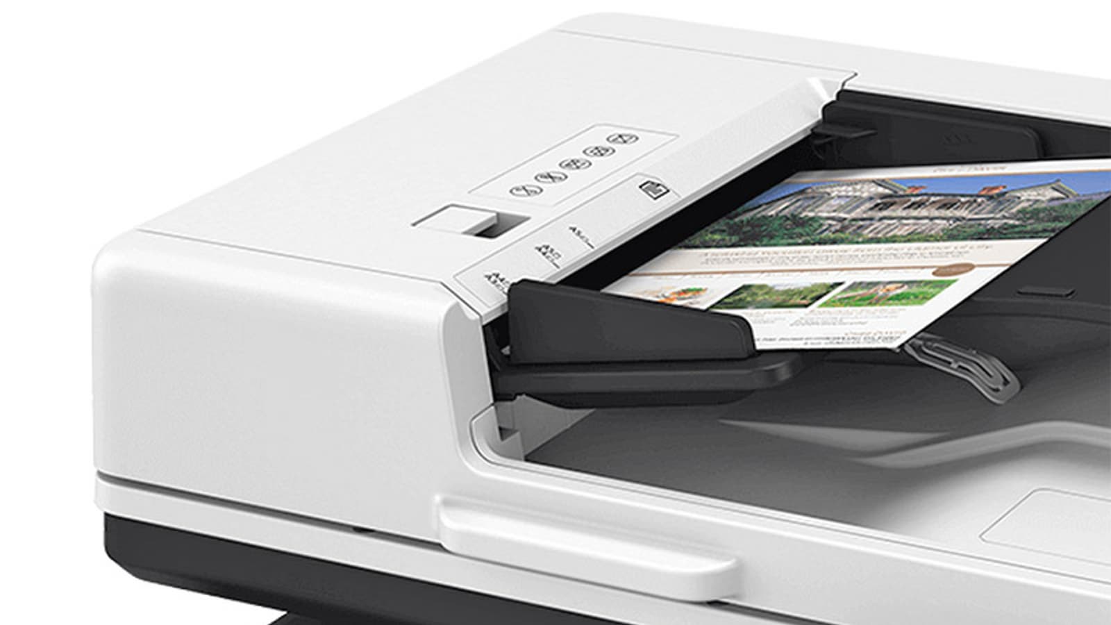 Подающий лоток АПД оснащен двумя датчиками определения размера документа (конечно, для стандартных форматов). Он вмещает до 100 листов офисной бумаги.