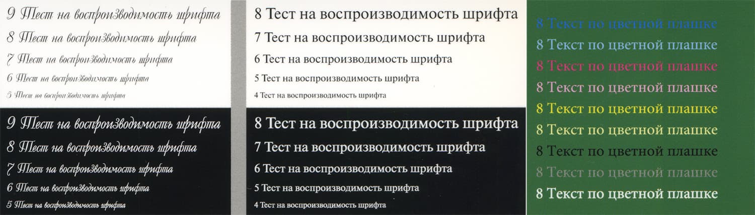 На текстовых полях при печати нормальной и вывороткой шрифты с засечками и без читаются от 4-го кегля, декоративный шрифт реально читается с кеглем от 6-го нормальный, а вывороткой даже от 5-го. Цветной текст на зеленой плашке выглядит неплохо, исключая разве что синий шрифт.