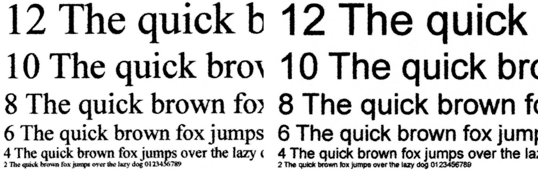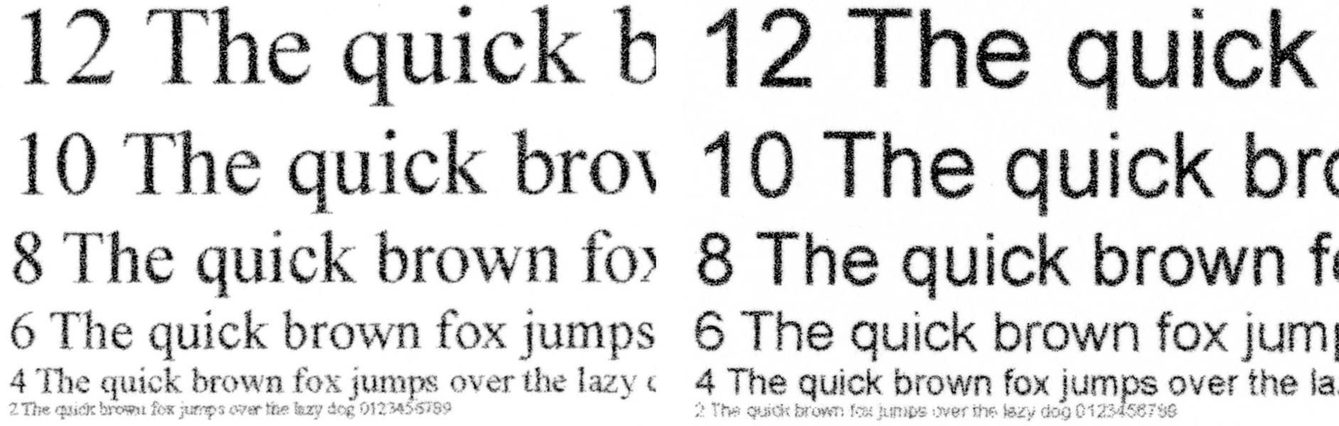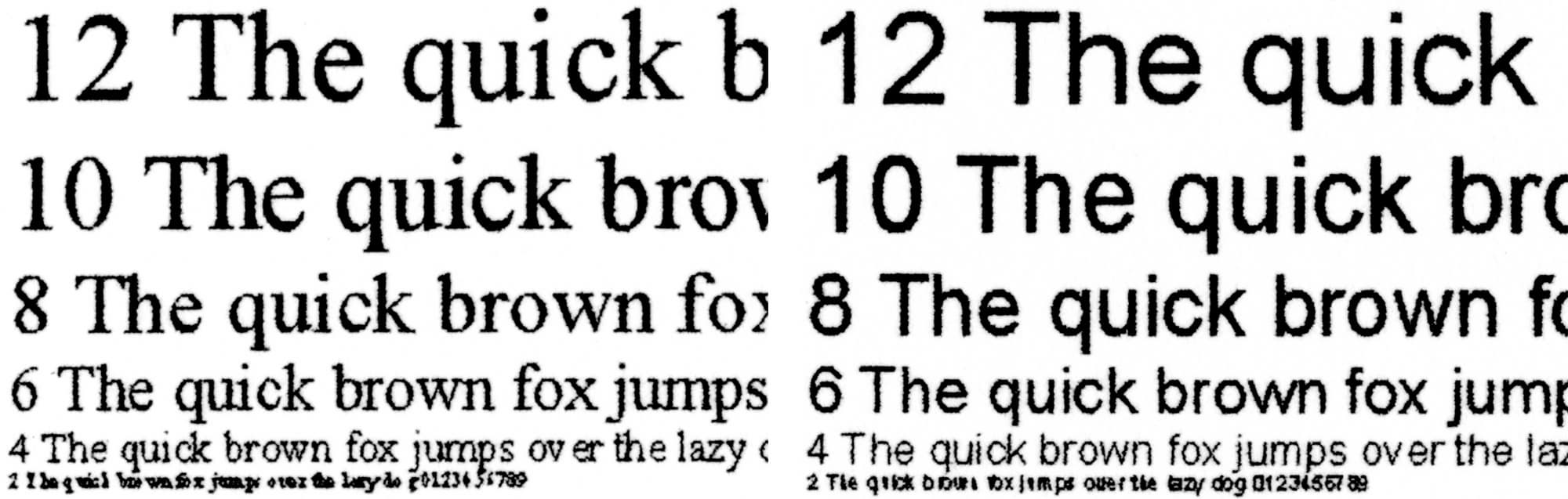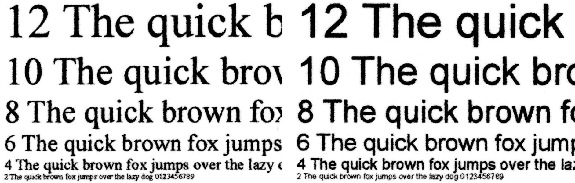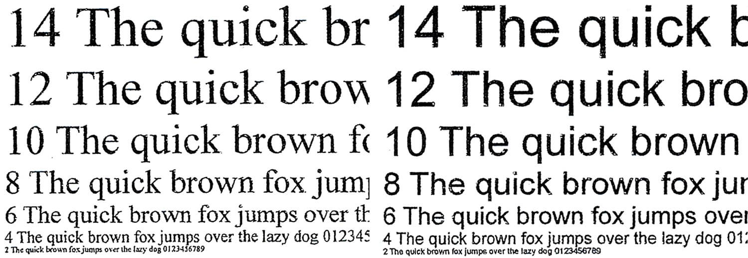 При печати передача текстовых образцов получается отличной: с разрешениями 1200 и 600 dpi разборчивость начинается со 2-го кегля как для шрифтов без засечек, так и с засечками (хоть и немного хуже). Если смотреть невооруженным глазом, контуры букв достаточно четкие, заливка плотная. При сильном увеличении становятся заметны неровности по краям символов — даже у хорошей бумаги есть поры, по которым происходит растекание чернил, но растра не видно.