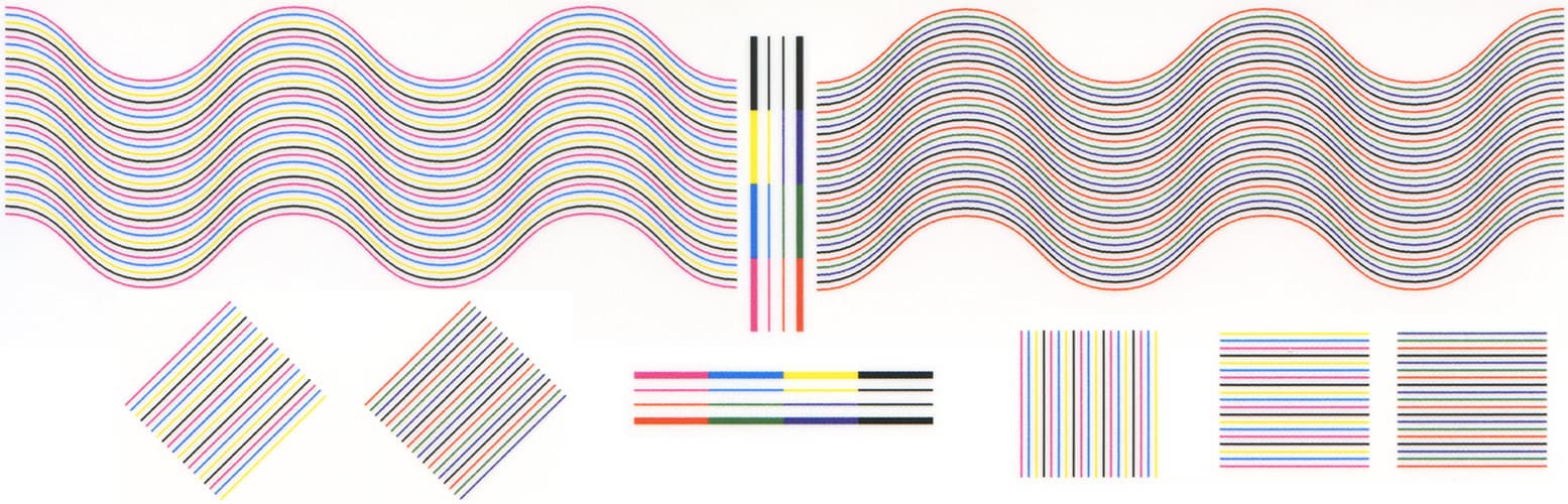 Совмещение красок по вертикали и горизонтали близко к идеальному. Тонкие линии воспроизводятся хорошо, без заметных даже при сильном увеличении разрывов и ступенек, на тонких изогнутых линиях нет перетеканий и ступенчатой структуры.