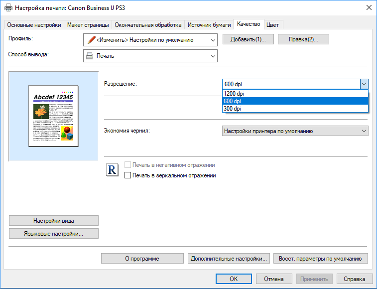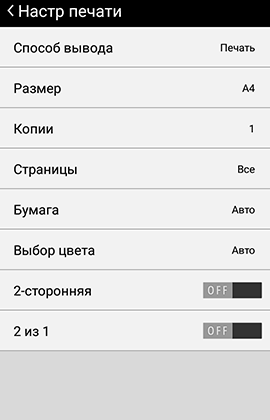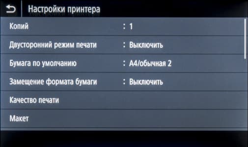 Набор для печати немного иной, чем для копирования — например, нельзя задать масштаб. Вместо плотности и резкости имеется регулировка яркости. Каких-то иных установок для качества (вроде разрешения печати) нет.