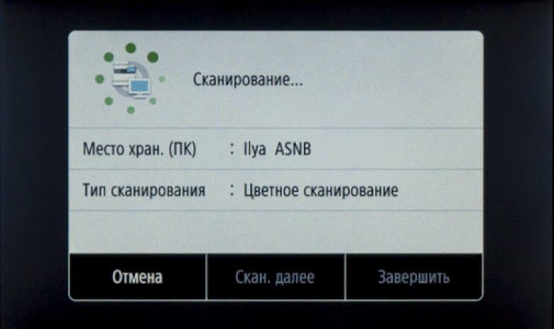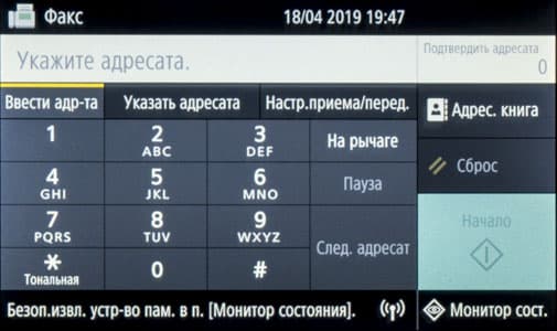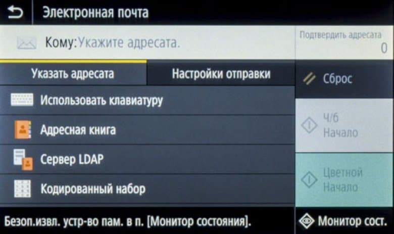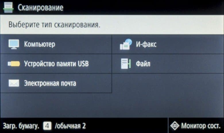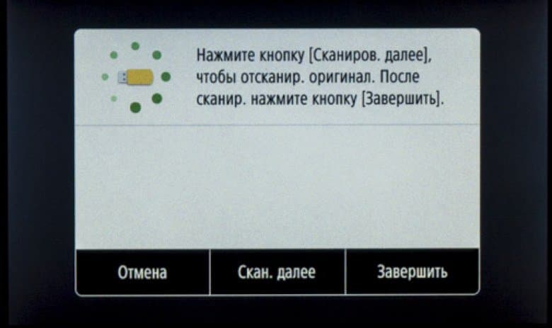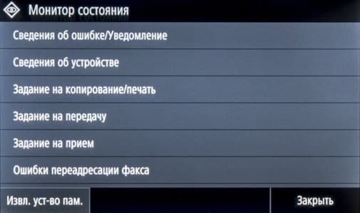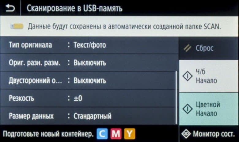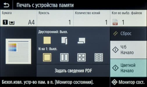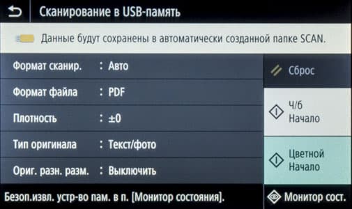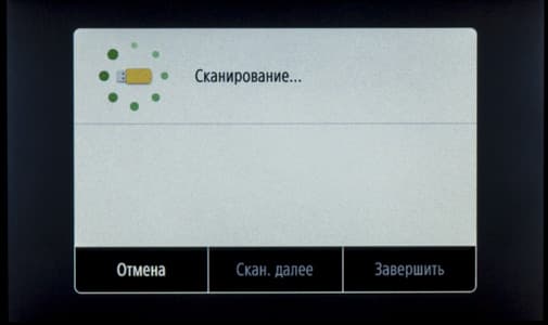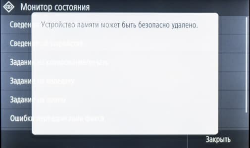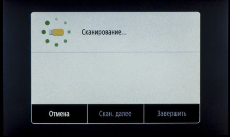 При установке такого накопителя в боковой порт USB на начальном экране ничего не отображается, надо нажать иконку «Печать с устр-ва памяти» либо «Сканирование».