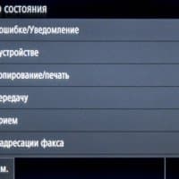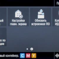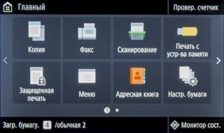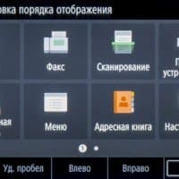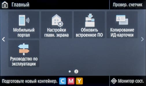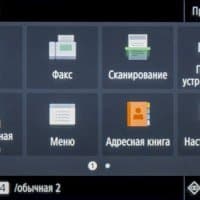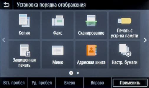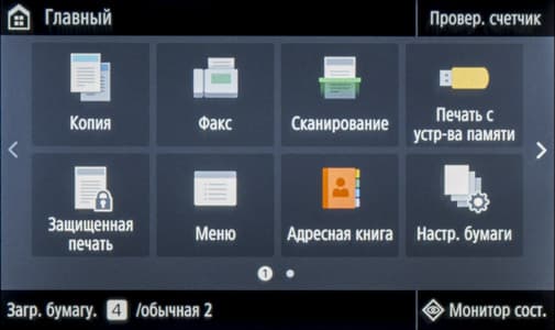 «Домашняя» страница экранного меню состоит из двух частей с горизонтальной прокруткой. На них находятся иконки основных операций — копирования, сканирования, работы с факсимильными сообщениями и со сменными носителями, вызова меню настроек, экранной справки и прочее. Состав «домашних» страниц и расположение иконок на них можно менять в соответствии со своими предпочтениями.