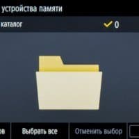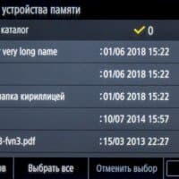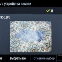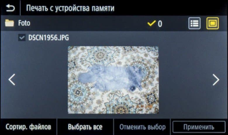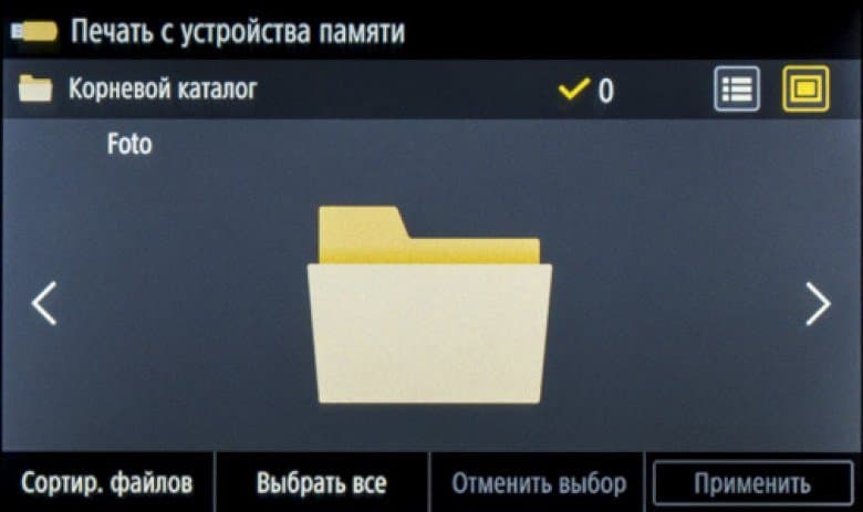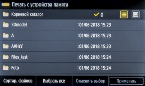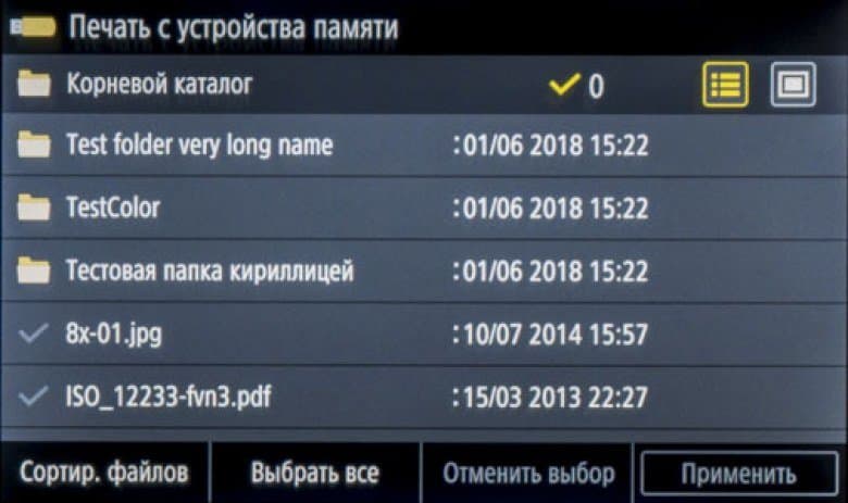 После подключения носителя и нажатия иконки «Печать с устр-ва памяти» появляется подобие проводника Windows с содержимым носителя, папками и файлами, причем можно задать показ списком или плитками (в этом случае изображения поддерживаемых форматов отображаются миниатюрами). Длинные имена и кириллица отображаются нормально, для файлов отображается дата/время создания, но без уточнения размера. Очень удобно, что показываются только поддерживаемые форматы: при наличии большого количества разных файлов это сильно облегчает поиск.