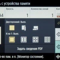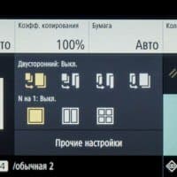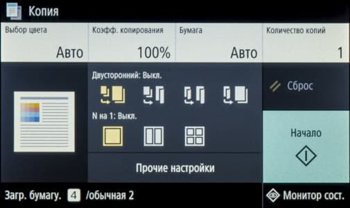 Отдельными группами иконок выведены управление одно- и двусторонним режимом, а также размещением нескольких документов (до 4) на одном листе копии с соответствующим уменьшением.