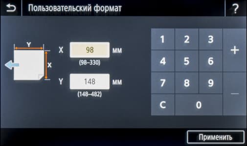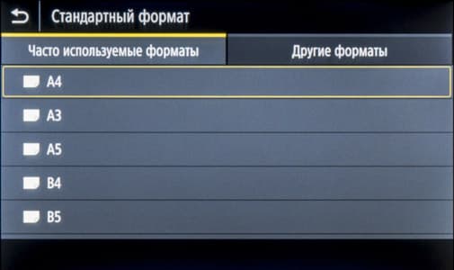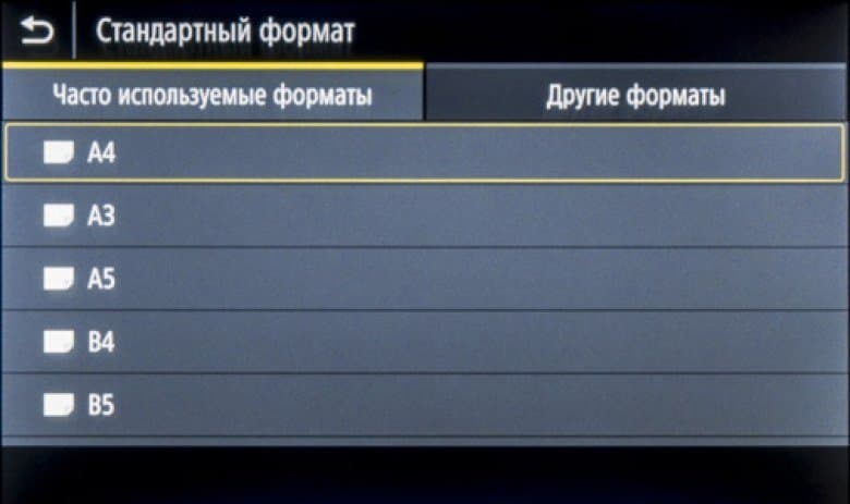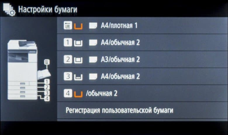 Отдельная иконка помогает задать тип и формат носителя — это удобно: не надо долго путешествовать по меню. Для каждого из выдвижных лотков задаются размер и вид бумаги (по умолчанию значится «Авто», это относится не к плотности — для нее есть список с указанием диапазонов, а к формату, но его можно задавать и как пользовательский, вводя размеры в миллиметрах), при использовании конвертов выбирается их формат из списка.