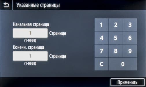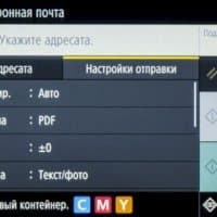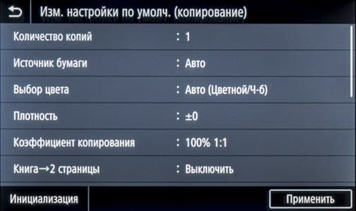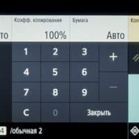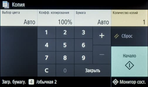 Различных настроек на странице функции копирования не так уж много. Вверху отдельными кнопками вынесены основные: режим цвета (полноцветный, черно-белый и авто), масштаб (или коэффициент копирования, от 25 до 400 процентов), выбор источника бумаги (и соответственно заданный для него тип носителя), количество копий; все числовые значения вводятся с появляющейся экранной клавиатуры.