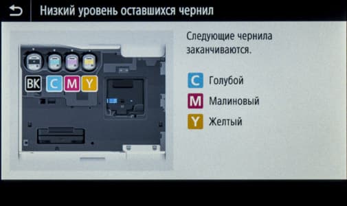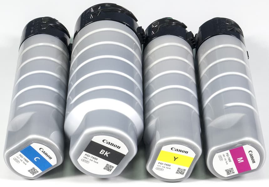 Картриджи с чернилами поставляются одного типа — XL с ресурсом для черного BK в 20000 страниц (его объем заметно больше), для цветных CMY по 16500 страниц. Причем в представительстве Canon нас заверили, что входящие в комплект поставки картриджи с пометкой «setup» такие же, но для первой заправки будет израсходовано изрядное количество чернил. У нас сообщения о скором окончании чернил в цветных картриджах из комплекта появились после печати 300 листов разного формата с текстами и изображениями, а также трех инициированных нами процедур очистки сопел (две из них обычные, одна глубокая, об этом ниже), поэтому мы рекомендуем заказывать дополнительный комплект картриджей вместе с поставкой самого аппарата.
