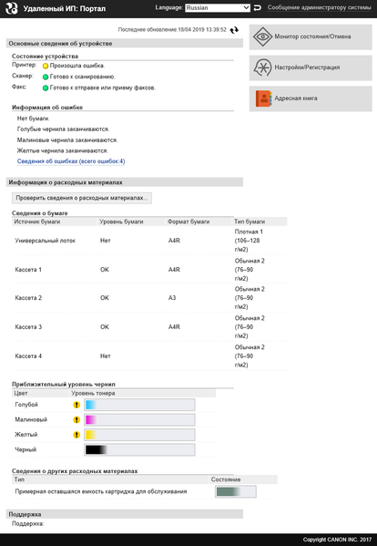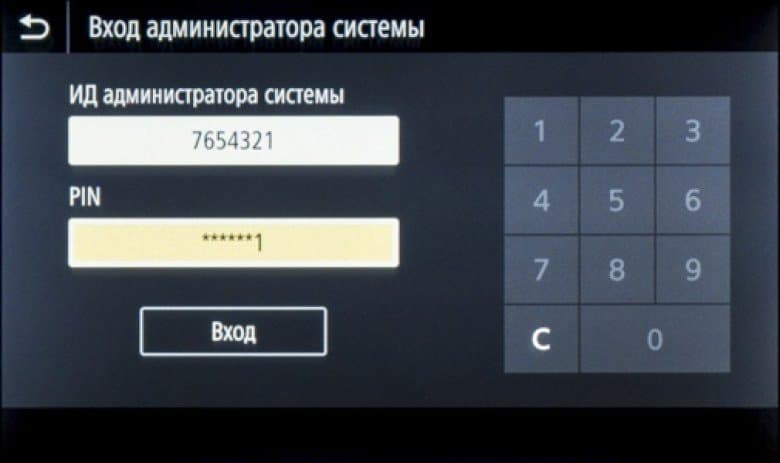 Для доступа к некоторым настройкам, включая персонализацию «домашних» страниц, нужно ввести ИД и PIN администратора. В имеющейся документации сведений о них мы найти не смогли, но подошли знакомые нам по другим аппаратам Canon «умолчания» — 7654321 для обоих этих значений. Конечно, ИД/PIN можно менять для обеспечения безопасности.