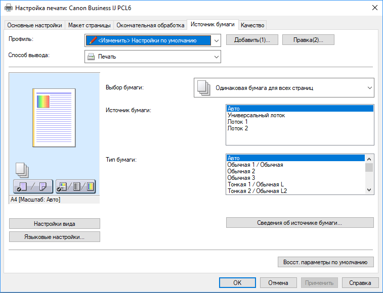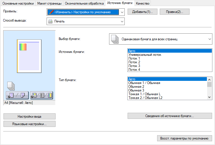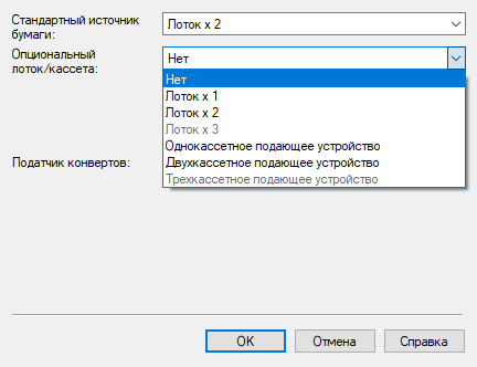 Для универсального лотка можно выбрать еще и «Указать при загрузке бумаги», а среди типов имеется пункт «Открытка».