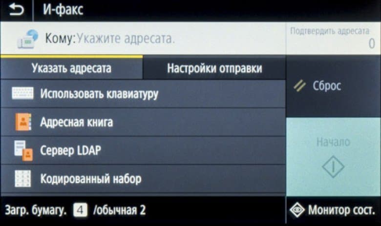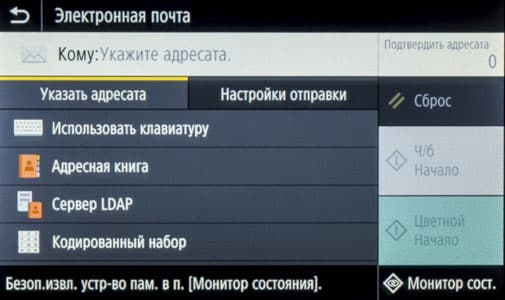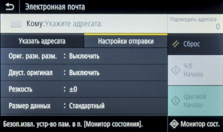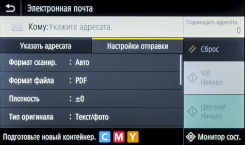 На панели есть и еще три кнопки, также сенсорные, левая управляет переходом в режим энергосбережения, средняя возвращает на экран «домашнюю» страницу, правая останавливает выполнение текущей операции.