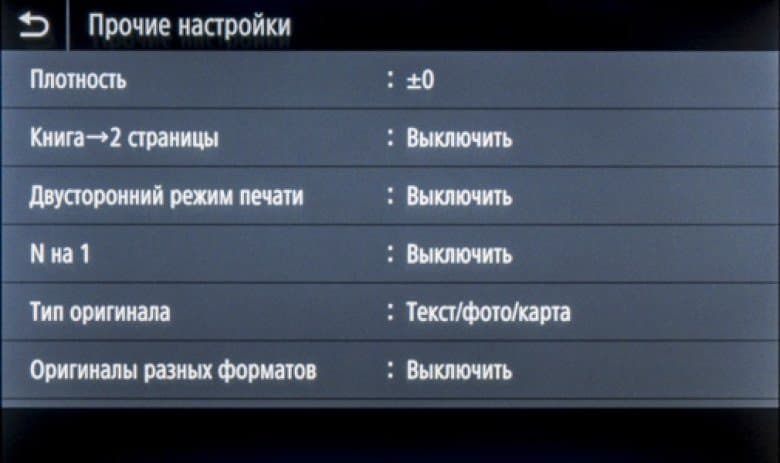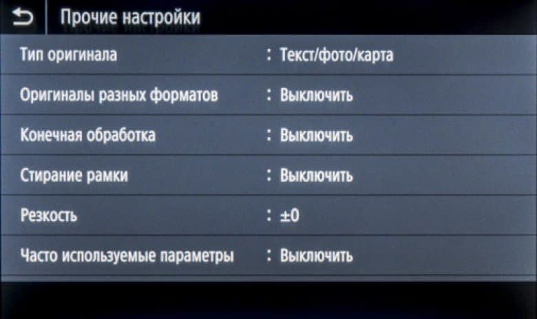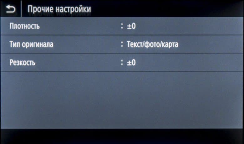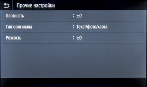 Менее употребимые установки вызываются экранной кнопкой «Прочие настройки»: плотность и резкость, тип оригинала (текст, напечатанное изображение и текст/фото/карта, то есть смешанный документ), стирание рамки и другие. Здесь же находится управление сортировкой для многостраничных документов.