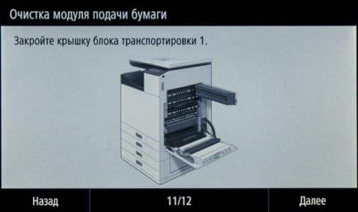 На правом боку есть еще две крышки (узкая вверху, которая поворачивается в горизонтальной плоскости, и большая ниже — на ней закреплен универсальный лоток, ее петли подразумевают поворот в вертикальной плоскости). Их замки разблокируются только при выборе в меню обслуживания операции «Очистка модуля подачи бумаги», при выключенном питании открыть эти крышки нельзя.