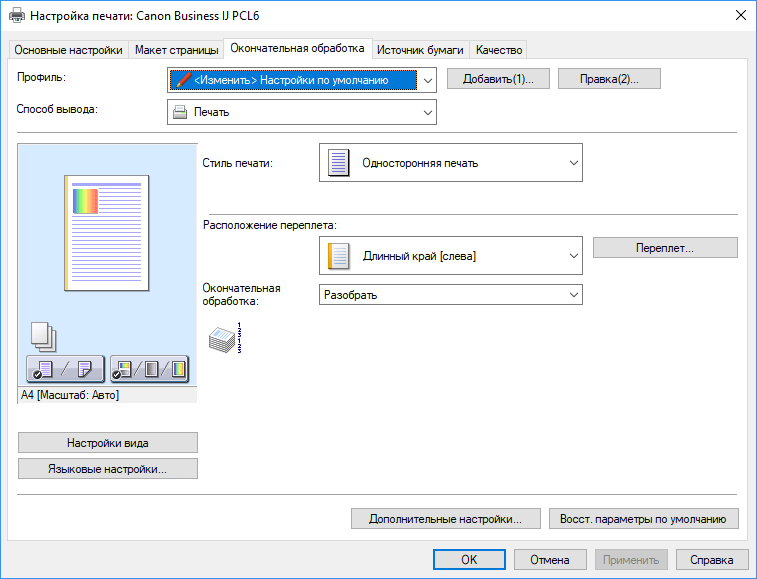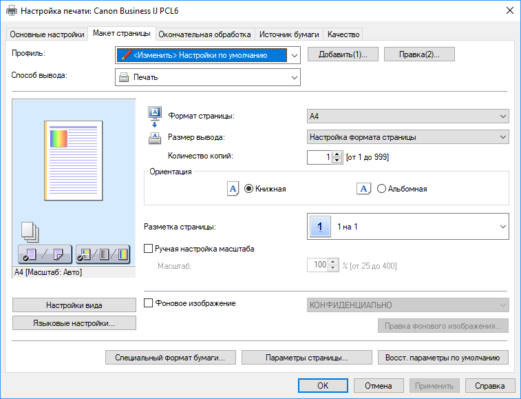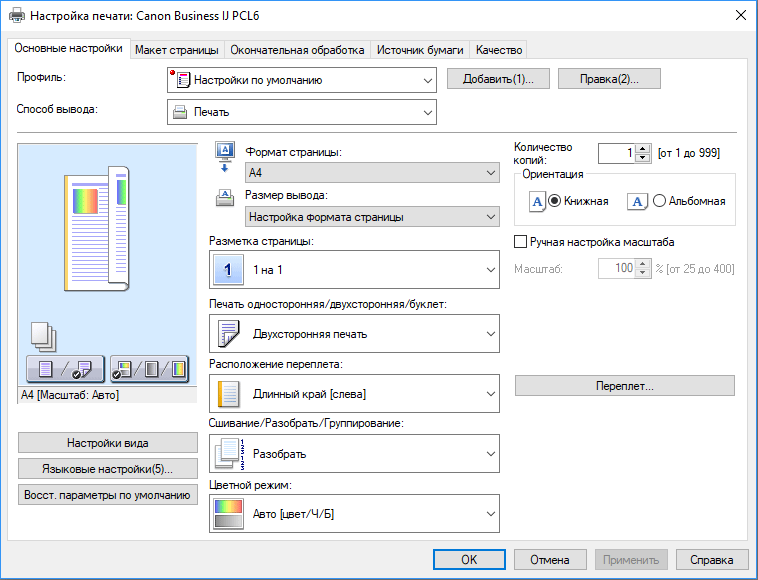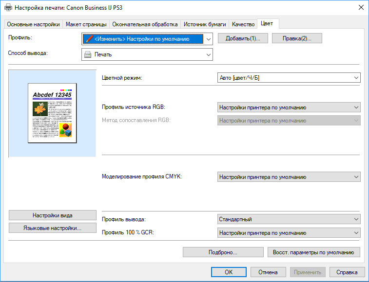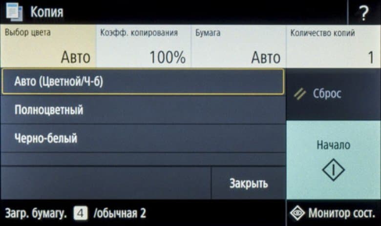Роль установки «Цветная / Черно-белая» играют отдельные кнопки начала печати.