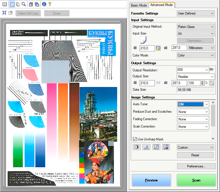 Для работы с USB-флешек задавалось сохранение в виде многостраничного PDF-файла (размер: стандартный), время замерялось от нажатия кнопки «Пуск» до появления сообщения об окончании записи файла, при сканировании с компьютера (драйвер ScanGear) — от старта кнопкой приложения до появления последней страницы в его окне.