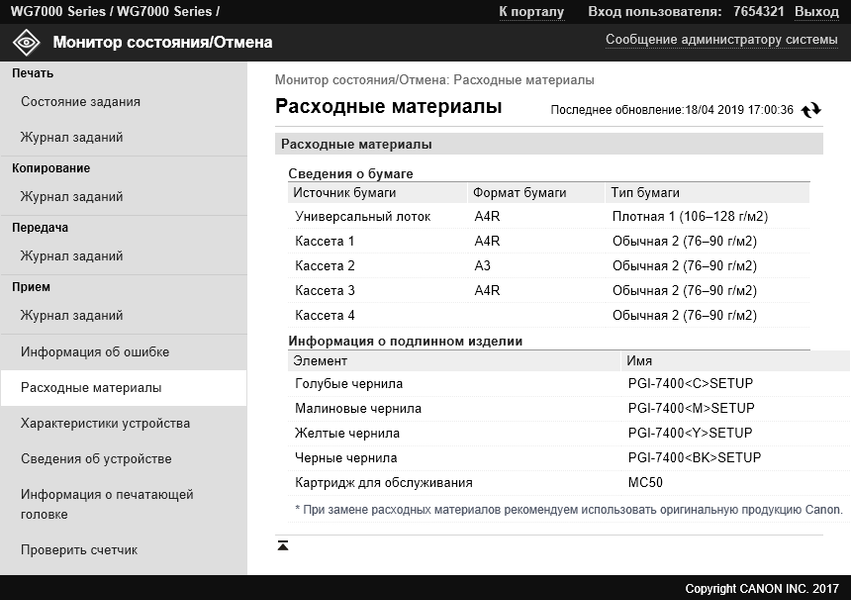 Во время тестирования полная информация об аппарате еще не была доступна: в открытых источниках отсутствовали и инструкции, и программное обеспечение. С драйверами нам помогли сотрудники представительства Canon, а вот с мануалами ситуация оказалась сложной: даже в представительстве нам дали ссылку на материалы только на японском языке и для серии WG7300, заверив, что это та же WG7400, только для японского рынка. Кстати, для серии WG7300 добавляется еще и словесное наименование «Business Inkjet», но в доступных материалах по WG7400 оно отсутствует.