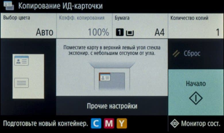 Для копирования удостоверений (или ID-карт — небольших оригиналов размером до А5 с двумя сторонами или двумя разворотами, которые будут помещены на одной странице копии) на «домашней» странице меню есть отдельная кнопка. Отличие экрана управления этой функцией в отсутствии некоторых настроек (например, масштабирования) и в наличии подсказок относительно места расположения документов на стекле.