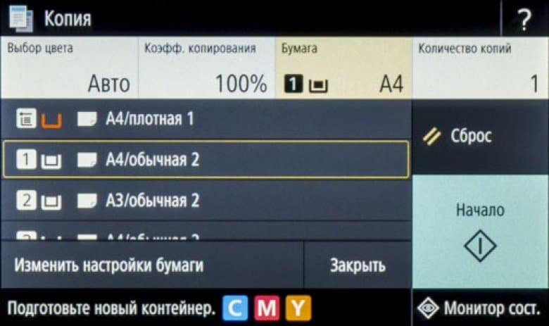 В приемный лоток помещается до 250 листов А4 и до 100 формата А3.