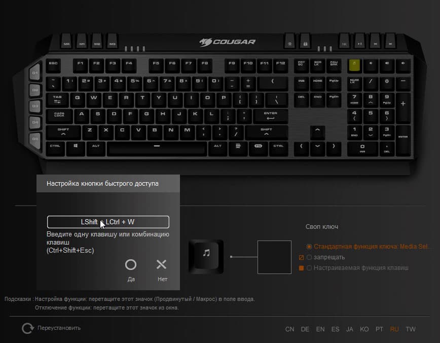 Перепрограммировать можно почти любую клавишу. Исключения составляют клавиши, расположенные в двух верхних блоках, а также клавиша Fn. Разрешенным кнопкам можно присвоить любое клавиатурное сочетание.