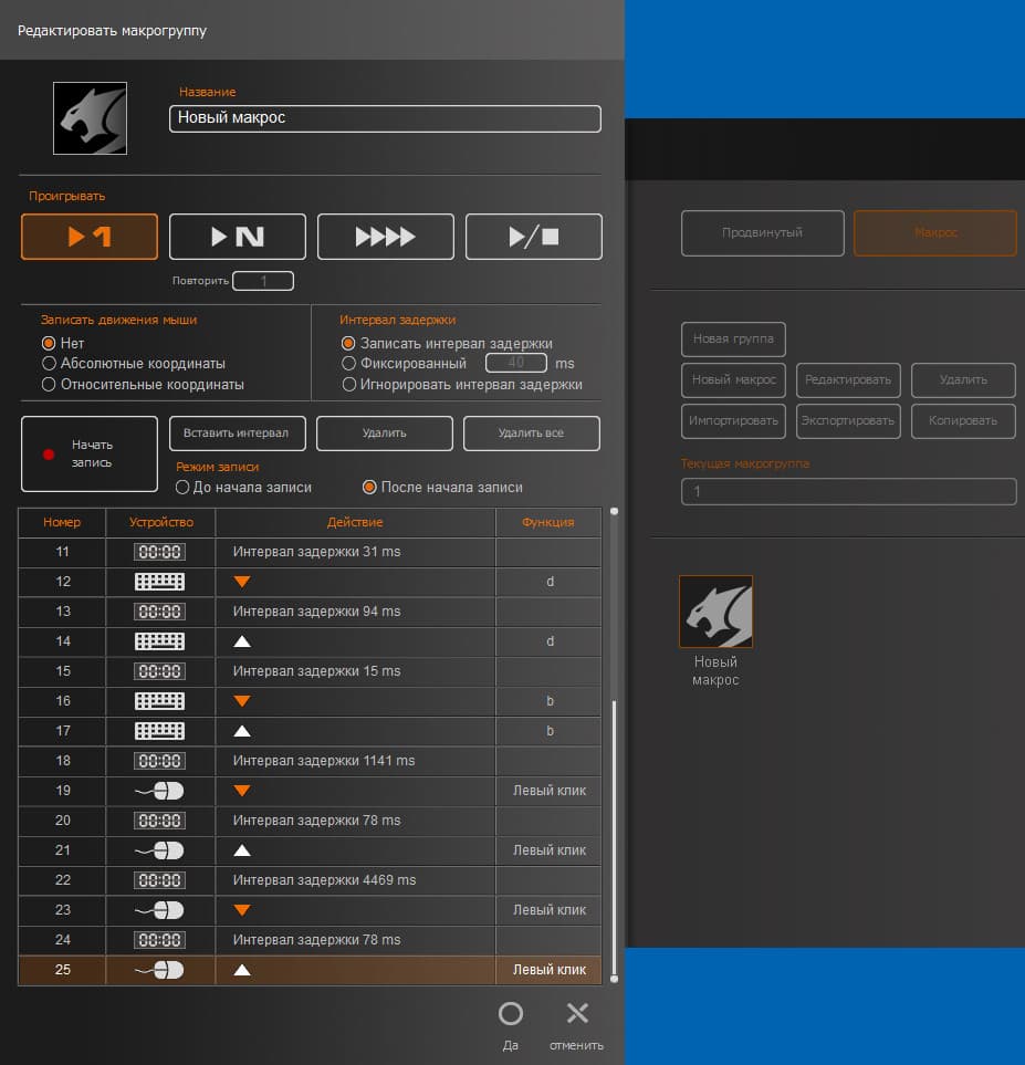 А вот и он, блок, в котором создаются макросы. Видно, что, помимо простой записи последовательности действий, здесь можно выбрать запись абсолютных или относительных координат курсора мыши, настроить многократный запуск макроса, отредактировать уже записанный макрос.