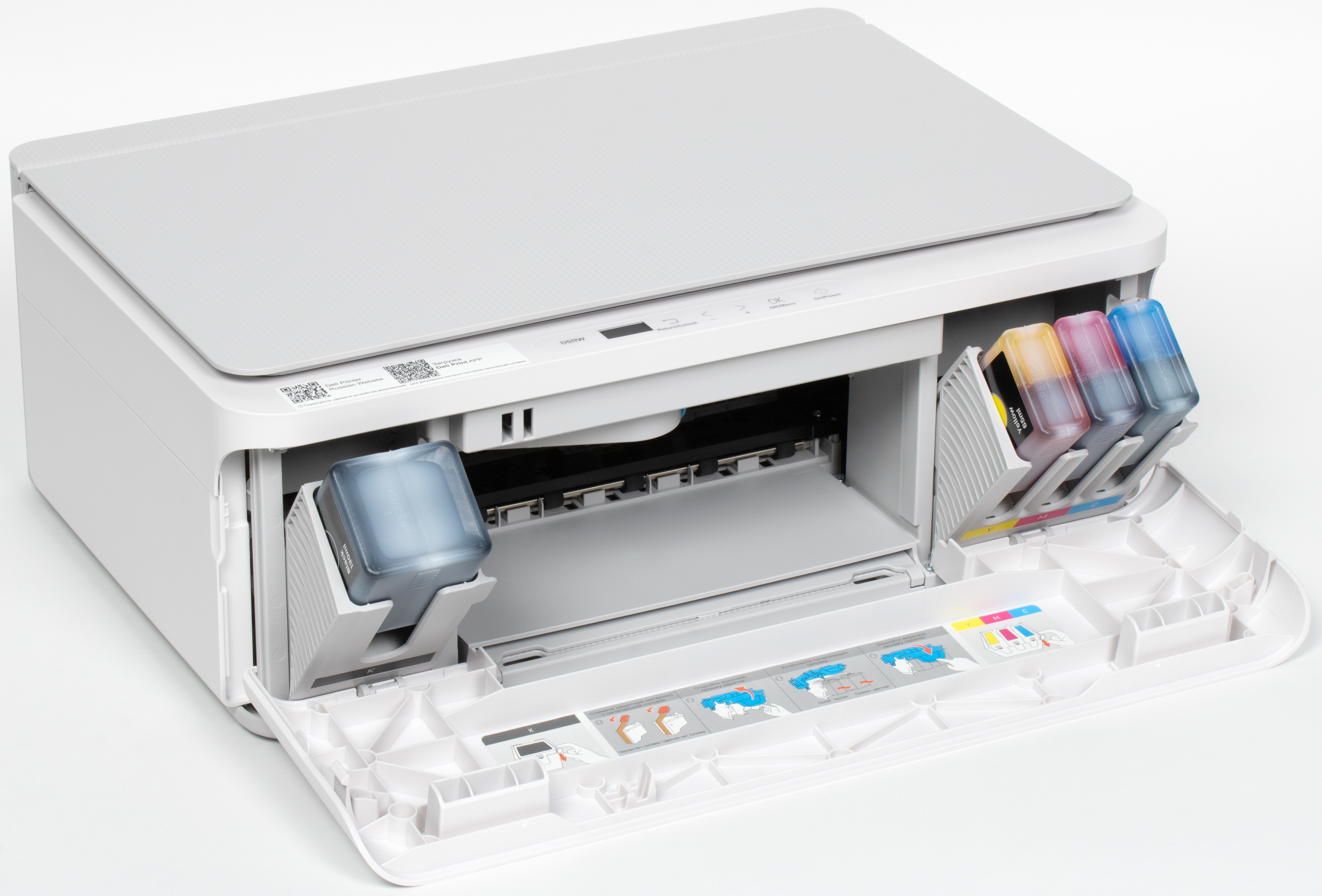 Таким образом, доливать чернила нельзя, следует просто извлекать опустевшие контейнеры и заменять их новыми. Трудно судить умозрительно, является ли такое решение более (или менее) удобным, чем привычные бутылочки — это может показать только длительная эксплуатация. Не сможем мы и сказать, будут ли контейнеры опустошаться полностью к моменту остановки печати с сообщением о необходимости замены одного из них: в отведенное на тестирование время напечатать около 7 тысяч страниц невозможно. Кстати: из имеющихся материалов непонятно, будет ли вообще такая остановка или печать продолжится с отсутствием одного цвета (оптимальный вариант: продолжение черно-белой печати после окончания чернил одного из цветов C, M, Y).
