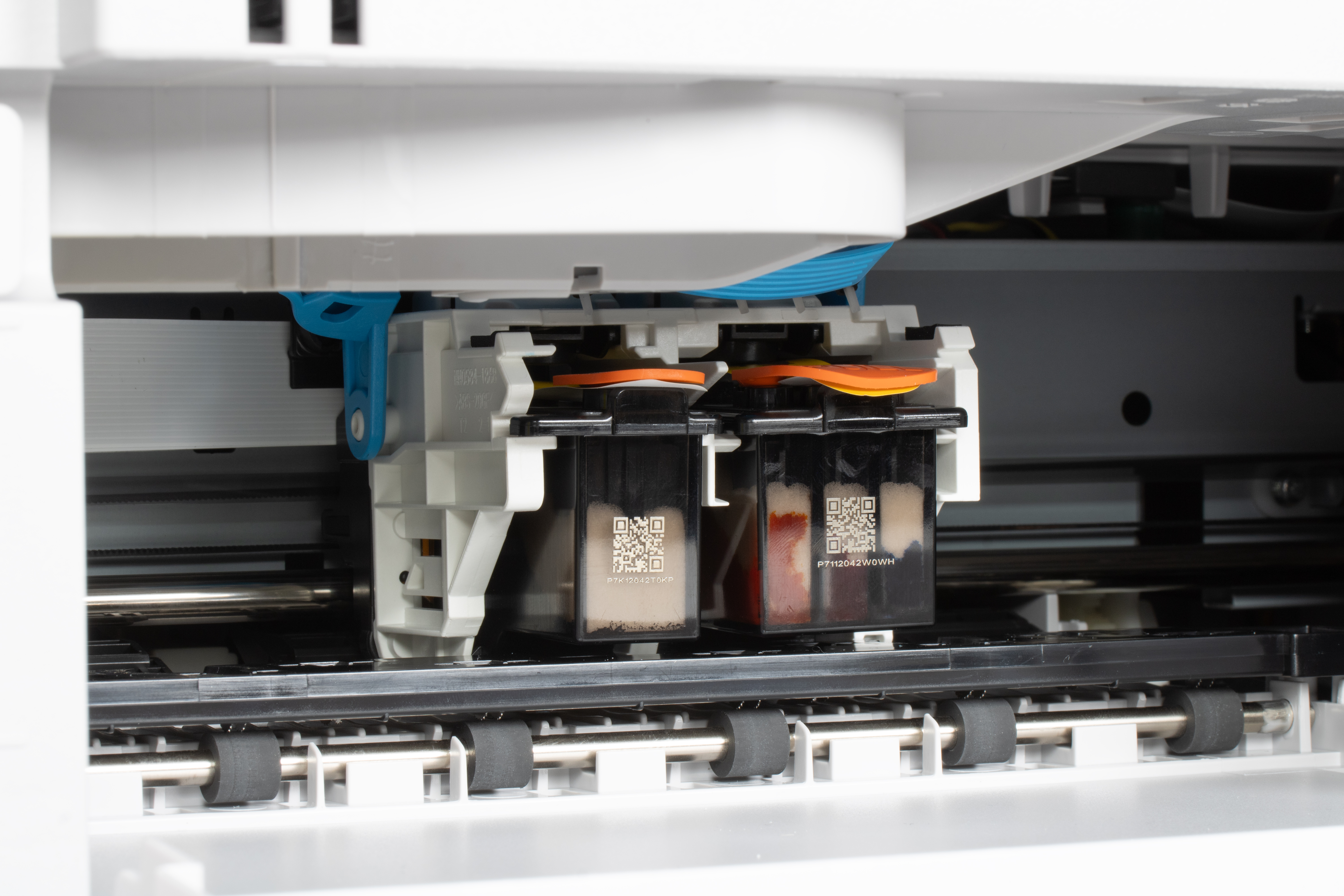 Обычно верхняя часть МФУ целиком откидывается вверх, предоставляя доступ к узлам и механизмам, но в данной модели этого нет, открыть можно только фронтальную крышку, за которой располагаются парковочное место каретки с печатающими головками и «чернильницы». Также можно увидеть механизмы и трубки подачи чернил.