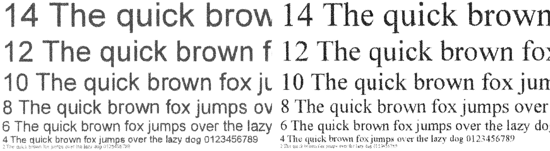 На копиях, сделанных с оригинала, на котором читаются шрифты 2-го кегля, с качеством «Стандартное» заливка получается вполне приемлемой, шрифты читаются от 4-го кегля с засечками и без. Установка качества «Оптимальное» немного увеличивает плотность, но на читаемость почти не влияет, а скорость при этом снижается весьма существенно, и использование такой установки для подобных оригиналов смысла не имеет.