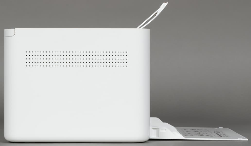 На боковых и задней поверхностях есть вентиляционные решетки. Вырезов под захват пальцами при переноске по бокам нет, но они особо и не нужны — принтер достаточно легкий.