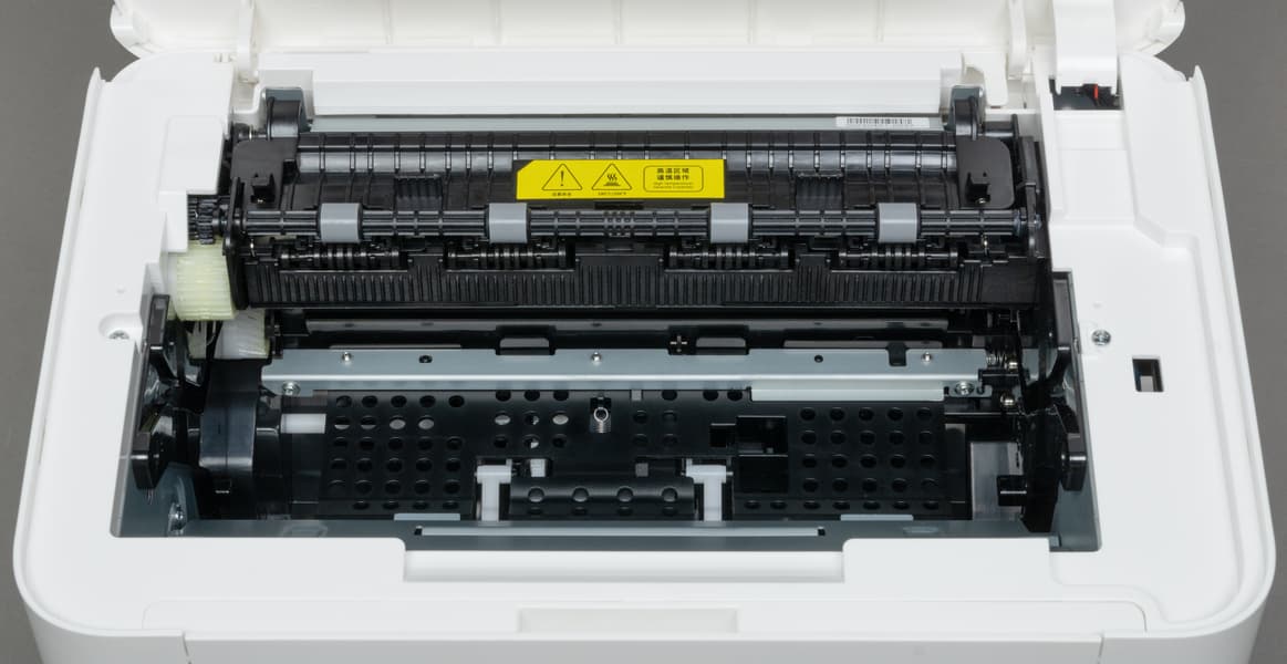 Верхняя часть принтера вместе с приемным лотком откидывается, открывая доступ к месту установки картриджа. Перед первым включением картридж надо извлечь (это делается с некоторым усилием) и удалить защитный лист черной бумаги.