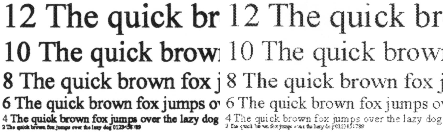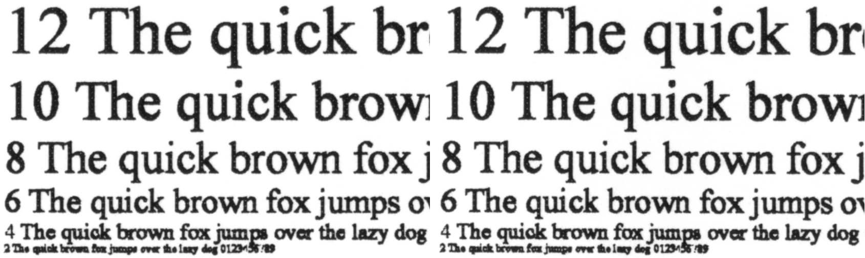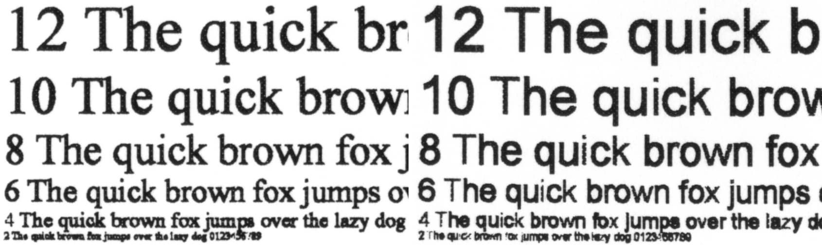 Переход к «Fast600 DPI» немного уменьшает плотность заливки — она перестает быть избыточной, что положительно сказывается на читаемости шрифтов малых размеров: хотя контуры уже не столь ровные, а растр при некотором увеличении становится заметным, из-за чего самые тонкие линии получаются рваными, но можно уверенно разобрать 4-й кегль с засечками и без. И если учесть показанное выше возрастание скорости печати, то данную установку можно рекомендовать как основную для печати текстовых документов, дополнительным бонусом будет некоторое снижение расхода тонера.