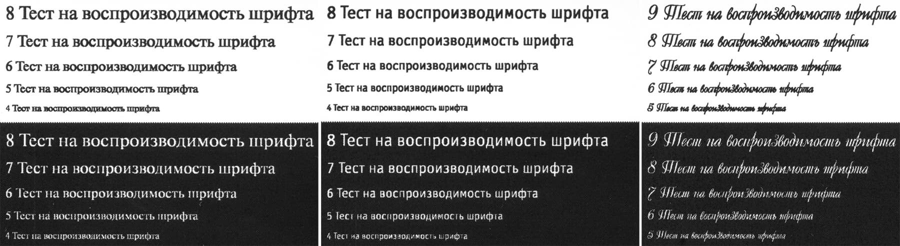 На текстовых полях при нормальной печати 4-й кегль для шрифтов без засечек разобрать можно, а с засечками читается с трудом; при печати вывороткой различимость начинается соответственно с 5-го и 6-го кеглей. Декоративные шрифты читаются с 7-го кегля, но не слишком уверенно, особенно для выворотки.