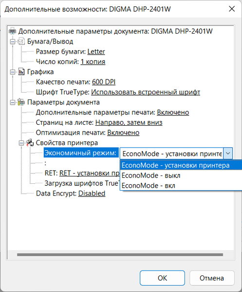Кроме того, в настройках драйвера для режима экономии тонера предусмотрен выбор «Economode — установки принтера», то есть подразумевается, что включить этот режим можно и без драйвера, но веб-интерфейс такой возможности не предоставляет.