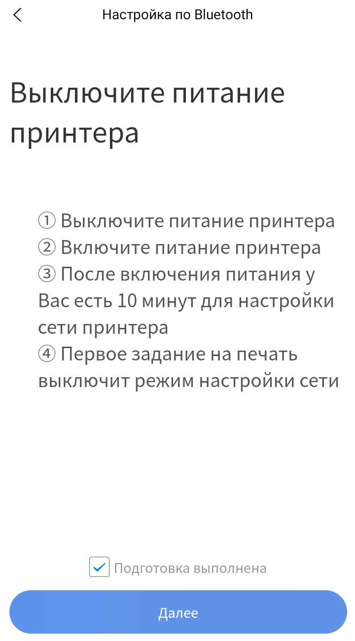 Запускаем установленное приложение, при необходимости выбираем язык и нажимаем «Настройка по Bluetooth». Дальше выключаем-включаем принтер, ставим галочку в графе «Подготовка выполнена», нажимаем «Далее» и ждем, когда принтер будет обнаружен.