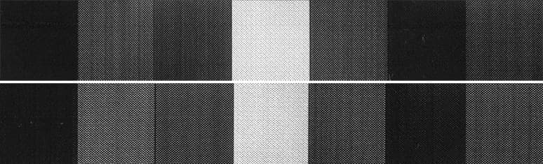 Различимость шкалы нейтральных плотностей на светлом конце посредственная — от 7-8 процентов, а на темном простирается лишь до 80 процентов. Плашки довольно плотные, но растр заметен уже при небольшом увеличении.