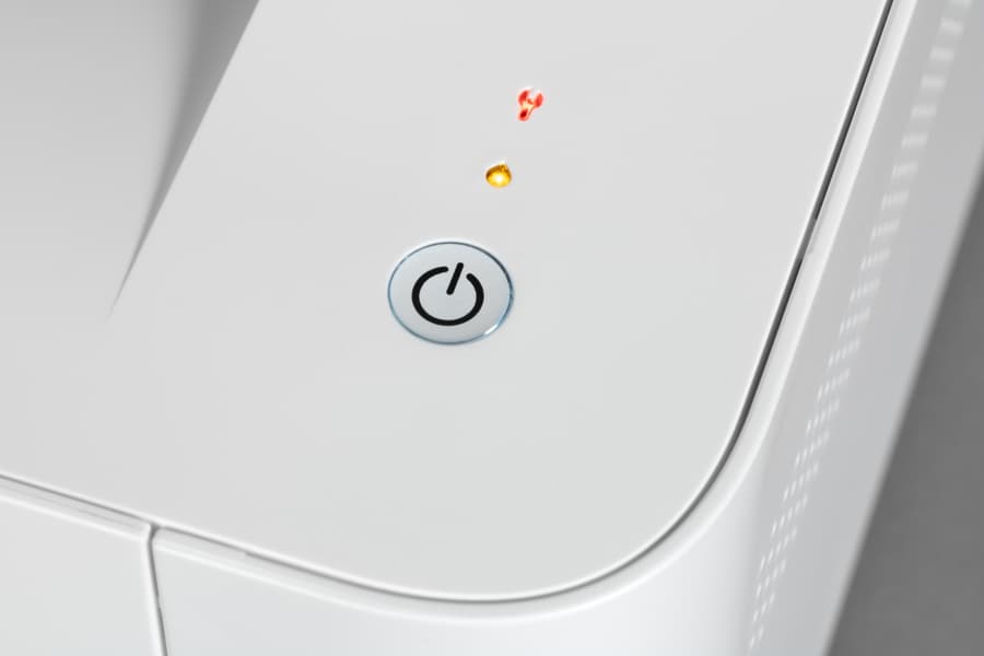 В режиме энергосбережения встроенный в кнопку белый индикатор мигает медленно, при печати — часто, в режиме готовности горит постоянно.