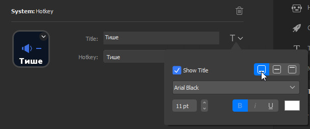 Теперь осталось отредактировать эту кнопку. Нужно сказать, что содержимое нижней панели зависит от редактируемой опции. Например, опция Hotkey предполагает использование любых клавиатурных сочетаний, а также все стандартные системные команды. Мы выберем из выпадающего списка команду уменьшения громкости.