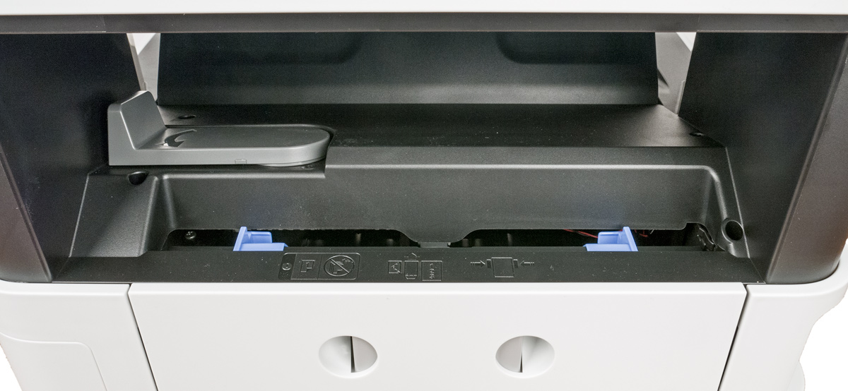 Верхняя половина фронтальной панели также откидывается, открывая доступ к тракту прохождения бумаги для извлечения застрявших листов.