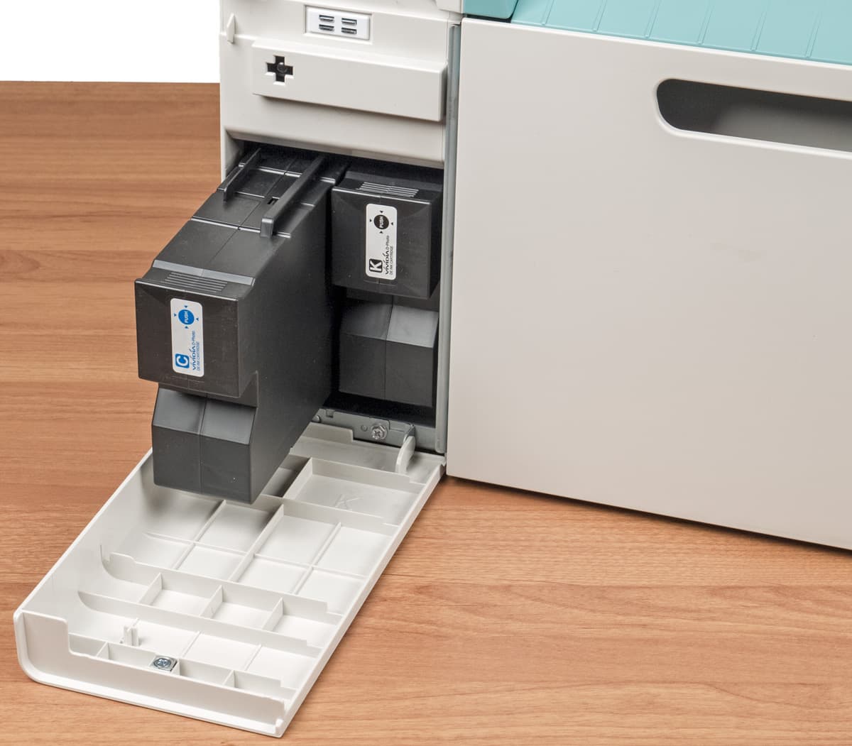 Штатного приемного лотка в принтере нет, после печати бумага обрезается в соответствии с выбранной длиной, выходит из прорези на передней части принтера и попросту падает вниз. Чаще всего это не будет удобным, поэтому придется потратиться на опциональный лоток для бумаги Print Tray DE, который обойдется в $177. Его вместимость до 50 листов.