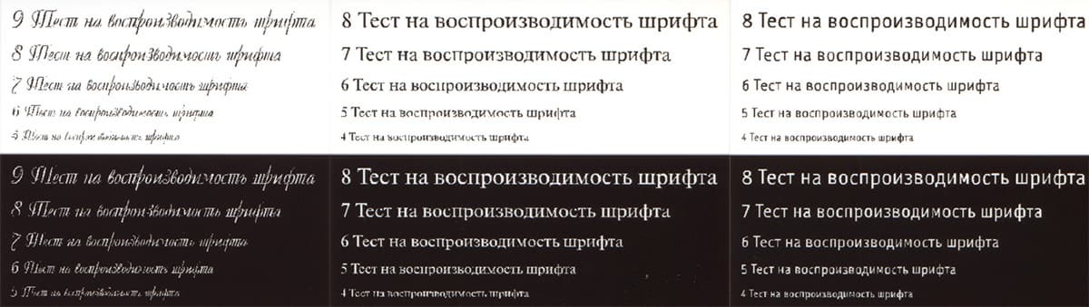 Обычные шрифты с засечками и без читаются с 4-го кегля, при печати вывороткой — с 5-го. У декоративного шрифта контуры букв получаются прерывистыми, поэтому читаются они только с 8-9 кегля, да и то не очень хорошо.