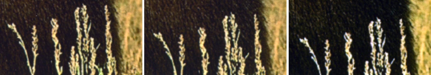 Вот участки сканов с самого края отпечатков одного и того же изображения, сделанных с установками «с полями» (слева), «без полей, Retain Size» (в центре) и «без полей, Auto Expand» (справа).
